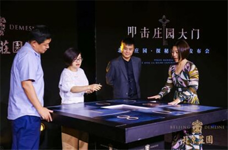在随后的启动仪式上,运通集团总裁李竑、和裕地产总裁助理兼营销中心总经理彭振石、和裕地产营销中心副总经理索颖,三位领导共同按动神秘礼盒,神秘礼盒缓缓打开,金钥匙缓缓升起。屏幕上出现一个巨型的达芬奇密码筒,密码筒转动之后北京庄园logo及样板间开放日期赫然出现。