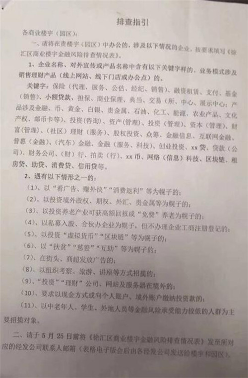 5月24日消息,网传上海徐汇区商业楼宇正在进行金融风险排查,所有公司名称、对外宣传或产品名称中含有保险、融资租赁、支付、基金、小额贷款等关键字样的,业务模式涉及销售理财产品(线上网站、线下门店或办公点)的,均需按要求填登记表。