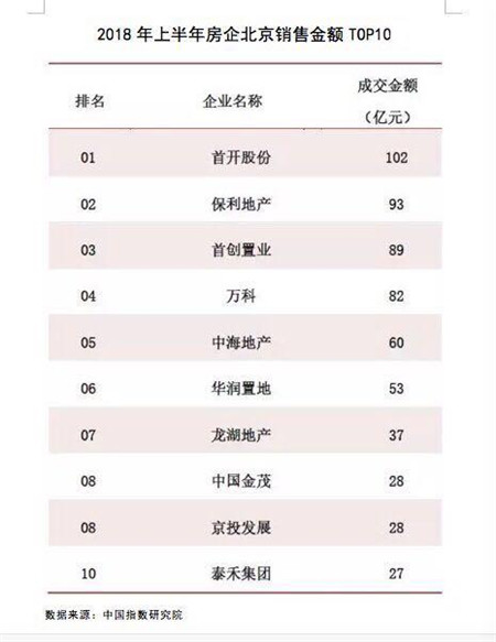 有数据显示,2018年上半年北京销售金额top10房地产企业合计销售额较去年同期下降了22%。