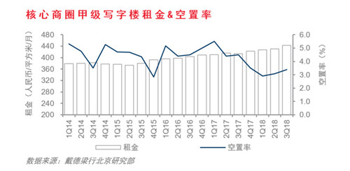 “如果跟2009年比较低迷的市场租金对比,现在的租金比那个时候增长了162%。”魏东说,今年第三季度的统计中,北京超甲级写字楼的空置率是2.7%,整个市场的空置率是7.9%,核心商圈是3.4%。“如果你是三年前租的写字楼,今年再去续签的时候,基本上会有16%到18%的租金涨幅。”