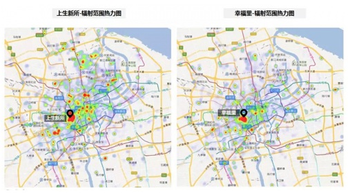 以上海最近的网红项目上生新所和幸福里为例,大数据展示到访客群的辐射范围。