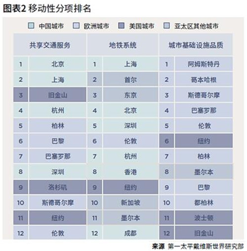 中国城市在共享交通服务领域是佼佼者。凭借交通设施的创新发展、适合骑行、步行的城市形态,以及充足的共享交通资源,北京位列本期技术城市"移动性--共享交通服务"分项排行榜的首位,上海紧随其后,并在细分项"地铁系统"中一举夺魁。在全球各地兴起的无桩共享单车项目有很多起源于中国,例如摩拜单车。杭州是全球共享单车投放量最高的城市,投放量一度达到80万辆。