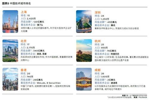 在技术城市排行榜上,上海以国际化商务环境和良好的居住环境列居第15位,北京作为中国首都,风投资本的主要目标市场,列居17位。深圳作为相对年轻的技术城市,与香港的连接日益增强(高铁通车后车程仅15分钟),凭借实力成长为创业枢纽,高新技术制造业中心。杭州房地产成本较低,城市规模也较小(950万人口),着名景点西湖亦被列为世界文化遗产。成都技术产业在技术外包服务业的支撑下,实现显着增长。当地政府努力营造优商、重商、亲商环境,支持商业发展;技术产业投资也在持续升温。