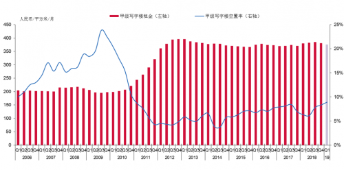 图二甲级写字楼平均租金和空置率