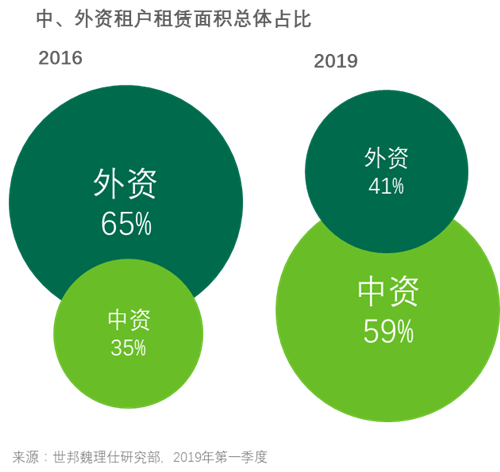 中资企业在北京甲级写字楼的租赁面积占比从2016年的35%上升至2019年的59%,从而取代外资企业成为甲级写字楼市场的主导力量。中资企业比例在央企总部集中的金融街和东二环等商务区提升尤其明显。中资企业对望京、奥体等非核心商务区也表现出比外资企业更高的接受度。