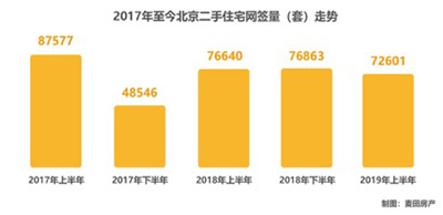 根据住建委网签数据显示,2019年上半年北京二手住宅网签量为72601套,月均网签量约12000套,和去年同期相比小幅下降5%,也是多年上半年成交量的低点。