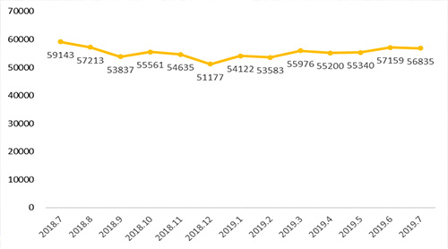 存量住宅经纪机构交易量预测值(用1-28日交易量同比例推测全月交易量)方面,7月环比增长6.86%,同比下降20.71%,市场略好于6月,但不如2018年同期。值得注意的是,北京经纪机构的二手住宅交易量,在今年3月达到了近一年的高峰,4-6月持续下滑,但下滑幅度逐步收窄,7月则止住下滑趋势,较6月小幅增长,市场整体趋势为止降趋稳。