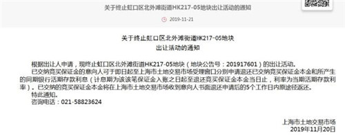 11月21日,上海土地市场官网显示,根据出让人申请,终止虹口区北外滩街道hk217-05地块(地块公告号:201917601)的出让活动。