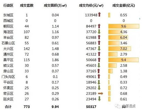 来自北京中原的统计数据显示,上周除通州、门头沟2区域成交额环比平稳外,朝阳、海淀、石景山、大兴、顺义、延庆等6区域成交额环比前一周上涨,包括丰台、昌平、房山、平谷、怀柔、密云等城区成交额环比下挫。